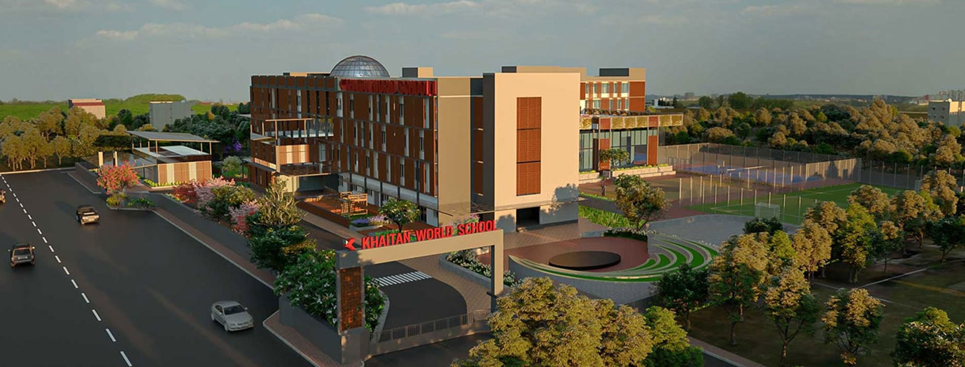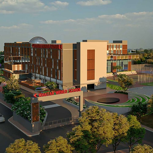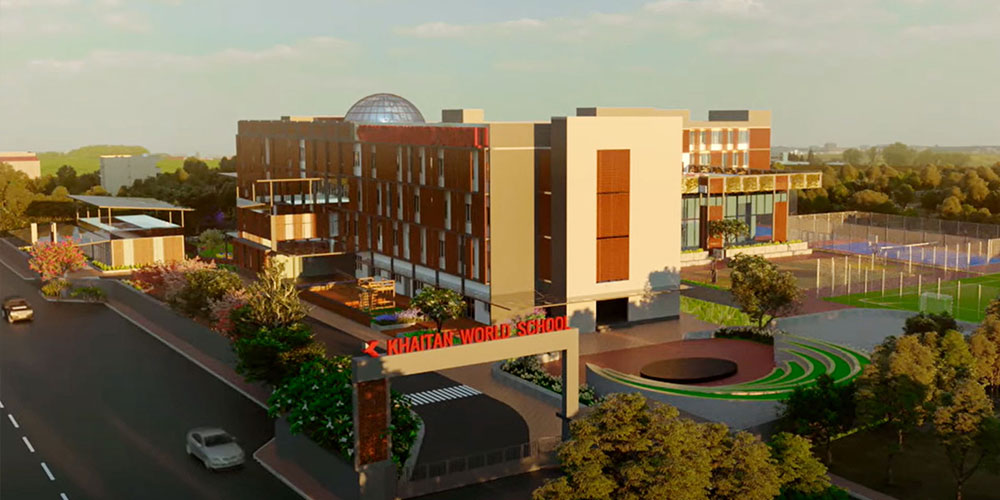 The Khaitan World School aims to enhance the traditional “chalk and talk” method of teaching by integrating it with the new age hands on learning and thus creating a smart learning environment. This unique idea has been translated into the architectural language of the facade. The facade symbolises the connection between old and new age learning. The introduction of second skin represents the traditional element that makes its presence felt when accompanied by the contemporary and modern-day elements.