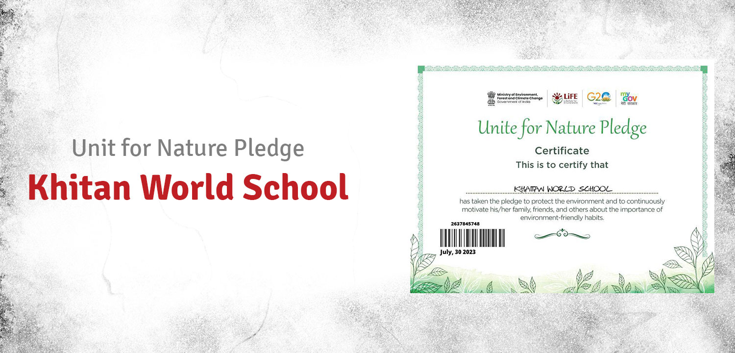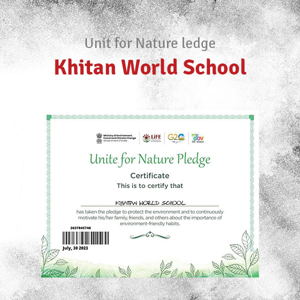 We are proud to announce that Khaitan World School has been awarded the “Unit for Nature Pledge Certificate”. This certificate recognizes our school’s commitment to environmental conservation and sustainability through various initiatives and campaigns. We extend our gratitude to our students, teachers, and staff for their dedicated efforts in making our school a greener and more eco-conscious institution. Together, let us continue our journey towards a sustainable future for generations to come.